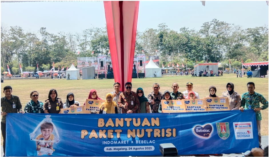 Bupati Magelang, Zaenal Arifin menyampaikan apresiasi dan terima kasihnya kepada Indomaret dan Bebelac yang berkenan memberi bantuan paket nutrisi. “Semoga bisa membantu dan bermanfaat bagi penerima serta dapat berkolaborasi dengan pemerintah Kabupaten Magelang dalam Corporate Social Responsibility (CSR) dan program-program lainya,” imbuhnya saat menyerahkan paket bantuan nutrisi didampingi Manager CSR PT Indomarco Prismatama (Indomaret), Untung Tri Haryono, Deputy Branch Manager Operational Indomaret Cabang Yogyakarta, Taffan Russuardi dan Sales Field Manager Bebelac, Dwi Lisetyowati kepada perwakilan penerima bantuan di Lapangan drh Soepardi Sawitan, Magelang, Kamis, 24 Agustus 2023.