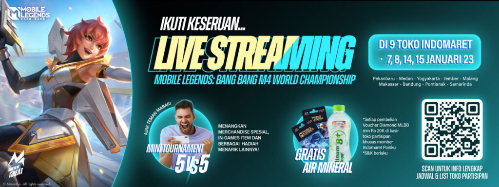 Indomaret, bekerjasama dengan Moonton selaku pengembang permainan daring Mobile Legends: Bang Bang (MLBB) mengadakan nonton bareng Live Streaming turnamen MLBB global, M4 World Championship di toko-toko Indomaret. Watch Party ini berlangsung pada 7, 8, 14 dan 15 Januari 2023 di toko-toko Indomaret Pilihan. Acara ini juga dikelola langsung oleh komunitas resmi MLBB, yakni Community Hero (CH) dan Moonton Student Leader (MSL) dari masing-masing kota.