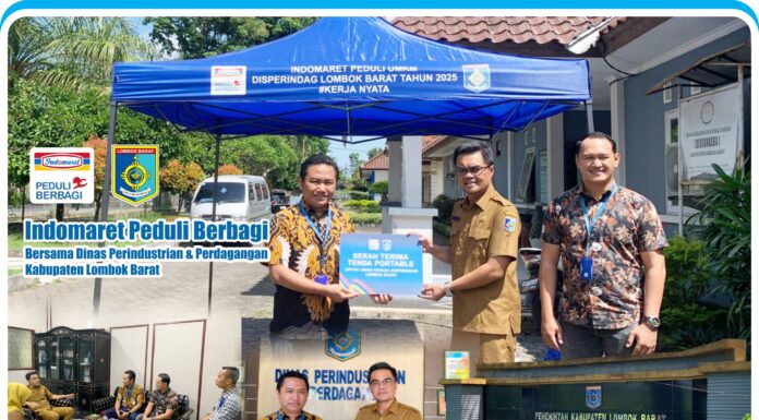 Lombok Barat (Inside Lombok) – Sebagai bentuk kepedulian dan dukungan terhadap perkembangan usaha mikro, kecil, dan menengah (UMKM) di Kabupaten Lombok Barat, Indomaret menyalurkan bantuan tenda portable melalui program Indomaret Peduli Berbagi. Bantuan tersebut diserahkan oleh Deputy Branch Manager Indomaret Lombok, Gilang Daril Umami, dan diterima langsung oleh Kepala Dinas Perindustrian dan Perdagangan (Disperindag) Lombok Barat, Lalu Agha.