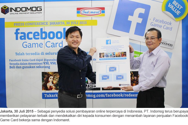 “Facebook Game Card yang telah dijual di Indomaret sejak 1 Juli 2015 dan memperoleh antusiasme yang baik dari para pecinta games, terutama bagi mereka para pecinta games Facebook yang mengikuti perkembangan berbagai games populer di dalam Facebook," demikian penjelasan  Paulce Lim, General Manager PT. Indomog, yang  didampingi Bastari Akmal, Marketing Senior Manager PT. Indomarco Prisamatama kepada pers di Indomaret Point Jalan Juanda, Jakarta, Kamis (30/7).