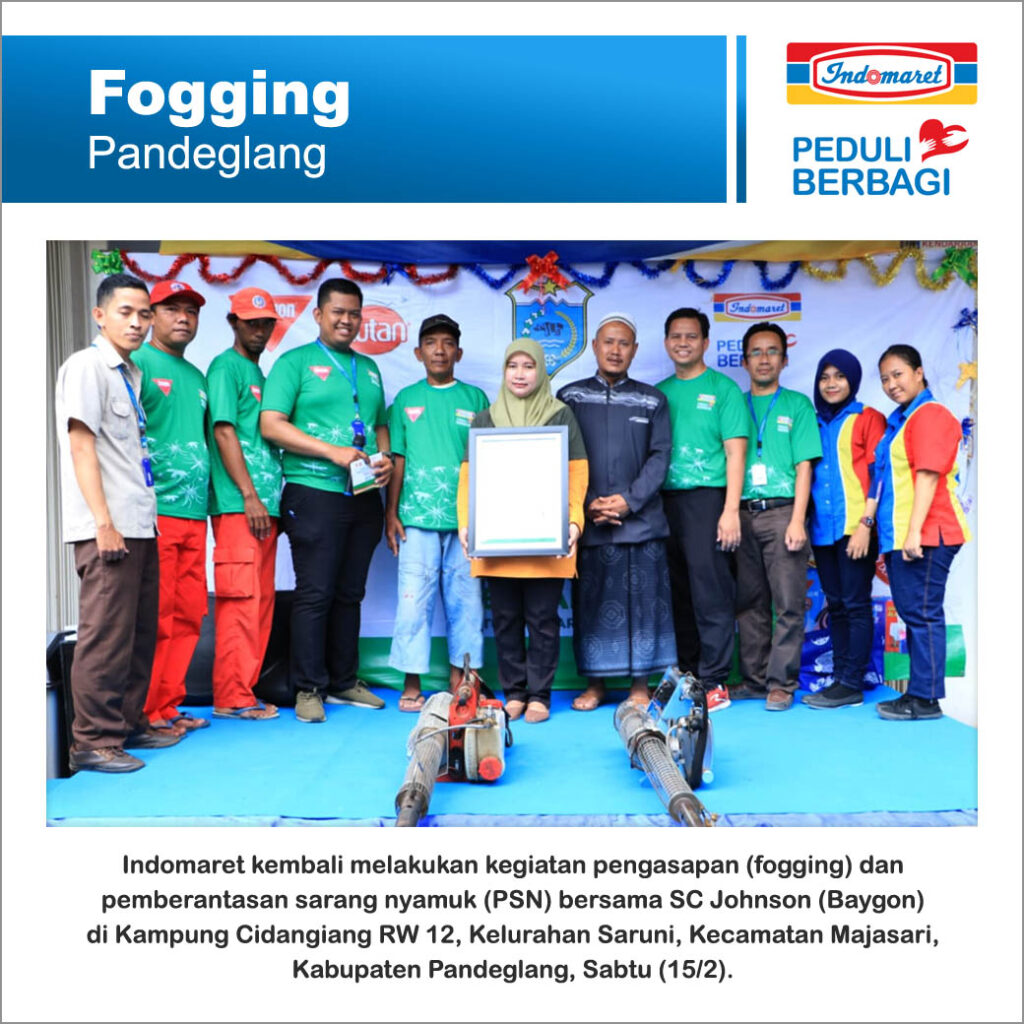 Indomaret kembali melakukan kegiatan pengasapan (fogging) dan pemberantasan sarang nyamuk (PSN), kegiatan ini dilakukan bekerja sama dengan SC Johnson (Baygon) di Kampung Cidangiang RW 12, Kelurahan Saruni, Kecamatan Majasari, Kabupaten Pandeglang, Sabtu (15/2). Kegiatan fogging dan PSN aedes aegypti dan ZIKA menjangkau 500 rumah penduduk untuk mencegah meluasnya penyakit demam berdarah (DB) yang marak terjadi.