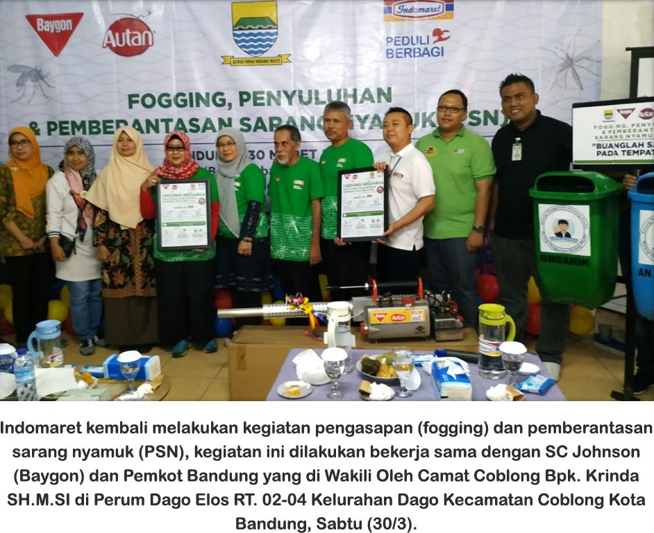 Indomaret kembali melakukan kegiatan pengasapan (fogging) dan pemberantasan sarang nyamuk (PSN), kegiatan ini dilakukan bekerja sama dengan SC Johnson (Baygon) di Indomaret Desa Bejagung Kec. Semanding Kab. Tuban, Sabtu (20/3). Kegiatan fogging dan PSN aedes aegypti dan ZIKA menjangkau 500 rumah penduduk untuk mencegah meluasnya penyakit demam berdarah (DB) yang marak terjadi.