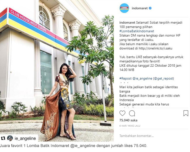 Selamat kepada 3 pemenang favorit Lomba Batik Indomaret 2018. Para pemenang favorit Lomba Batik Indomaret dipilih berdasarkan jumlah like terbanyak pada foto yang di posting di Instagram Indomaret.