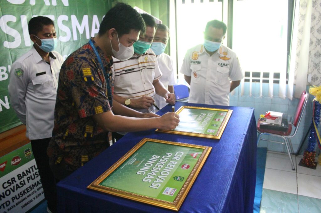 Kepala Dinas Kesehatan Kabupaten Subang, dr. Maxi dan Branch Manager PT Indomarco Prismatama (Indomaret) Purwakarta, Rony Hartono menandatangani piagam menandai selesainya renovasi Puskesmas Binong di Jl. Raya Binong, Kabupaten Subang, Rabu (9/6). Bangunan fisik Puskesmas kini lebih nyaman setelah dilakukan perbaikan oleh Indomaret bersama Baygon. Perbaikan pada bagian atap dan plafon serta pengecatan menyeluruh.Puskesmas juga diberi timbangan digital, alat cek pengukur tekanan tensi darah, serta tempat sampah.