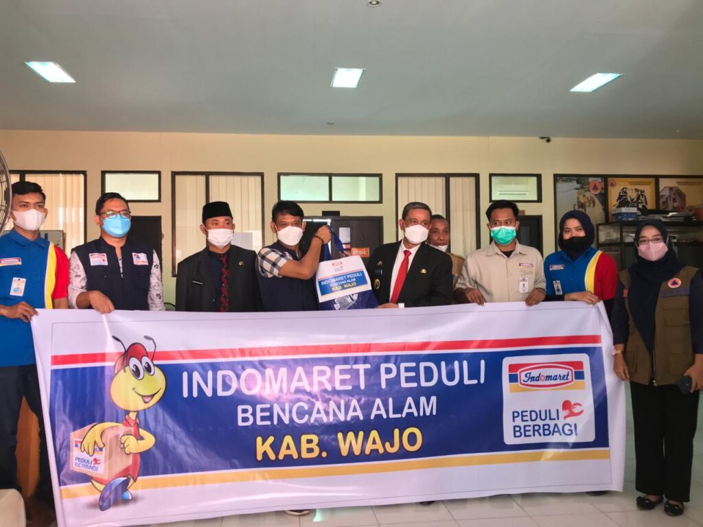 Indomaret kembali menyalurkan bantuan kepada masyarakat terdampak banjir di Kabupaten Wajo, Sulawersi Selatan, Bantuan sembako terdiri beras 5kg beras, gula pasir, mie instan, dan minyak goreng diserahkan Deputy Branch Manager Operations PT Indomarco Prismatama Makassar, Achmad Suyanto kepada Bupati Kabupaten Wajo, H. Amran Mahmud di Kantor Badan Penanggulangan Bencana Daerah (BPBD) Kabupaten Wajo, Selasa (12/10).