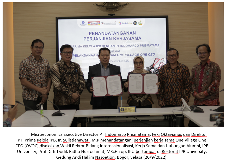 Microeconomics Excecutive Director PT. Indomarco Prismatama (Indomaret), Feki Oktavianus mengambil contoh filosofi semut dalam sambutannya. “Ini sebagai motivasi kita dengan mulai kecil untuk jadi besar. Agar nantinya, OVOC bisa diberdayakan hingga skala nasional,” ujar Feki dalam penandatanganan kerja sama dengan IPB University pada program OVOC di Rektorat IPB University, Gedung Andi Hakim Nasoetion, Bogor, Selasa (20/9/2022).