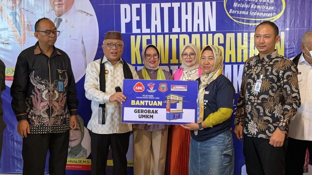 Pelatihan kewirausahaan mandiri UMKM di Gedung PLUT-KUMKM Kabupaten Gorontalo, pada Kamis (24/6/25) yang dibuka oleh Bupati Gorontalo, H. Sofyan Puhi, S.T., (kedua dari kiri) didampingi Deputy Branch Manager Indomaret Cabang Manado, Robby Hindarto (pertama dari kanan).