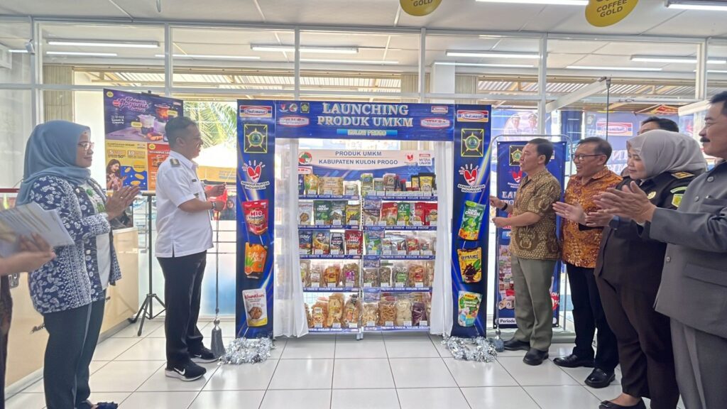 Launching 67 produk UMKM Kulon Progo oleh Wakil Bupati Kulon Progo, H. Ambar Purwoko, A.Md., (kemeja putih) dan Microeconomics Executive Director PT Indomarco Prismatama (Indomaret), Feki Oktavianus (kelima dari kanan) di toko Indomaret KUD Kasam, Kabupaten Kulon Progo, Sentolo, Kamis (26/6/25).