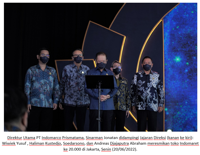 Toko Indomaret ke-20.000 dalam format fresh berada di kawasan Pantai Indah Kapuk, Jakarta. Rasa syukur pencapaian prestasi ini dirayakan secara sederhana namun penuh kehangatan bersama para mitra usaha di Menara Indomaret, Pantai Indah Kapuk, Jakarta, Senin (20/6/2022). Hadir para distributor, supplierfranchisee, konsultan, kontraktor, kreditor, principal dan shareholder,    di antaranya, Axton Salim serta Direktur Utama PT Indomarco Prismatama, Sinarman Jonatan dan jajaran direksi Indomaret. Hingga Mei 2022 tercatat 5.000 terwaralaba Indomaret.
